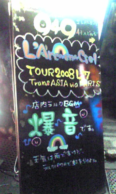 kenちゃんMCは楽屋の話。煩いと追い出され、練習部屋で練習してると、隣の部屋からタカタカタカタカ…と聞こえる。その話にゆっきー笑顔!!ヤヴァイよ…!!んで、更にショッカーのような雄叫びが…と思ったらteっちゃんだったと。結局teっちゃんも楽屋を追い出されメイクさんと同室に。残ったhydeも寂しくて結局キーボードさんと一緒にいるらしい。…そんな仲のいいL'Arc~en~Cielでした!!